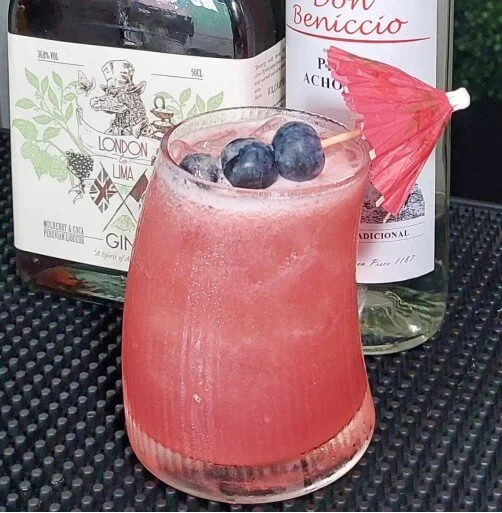 Pisco acholado, arándanos frescos, jarabe simple, zumo de limón, Lima to London gin de mulberry y coca, hielos